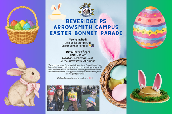 The end of term 1 is only one week away, which means we have our junior campus Easter bonnet parade on Thursday morning (9:15am), we find out who wins the many hampers from the raffle and of course we get our delivery of hot cross buns. I hope you are all looking forward to the Easter celebrations next week.